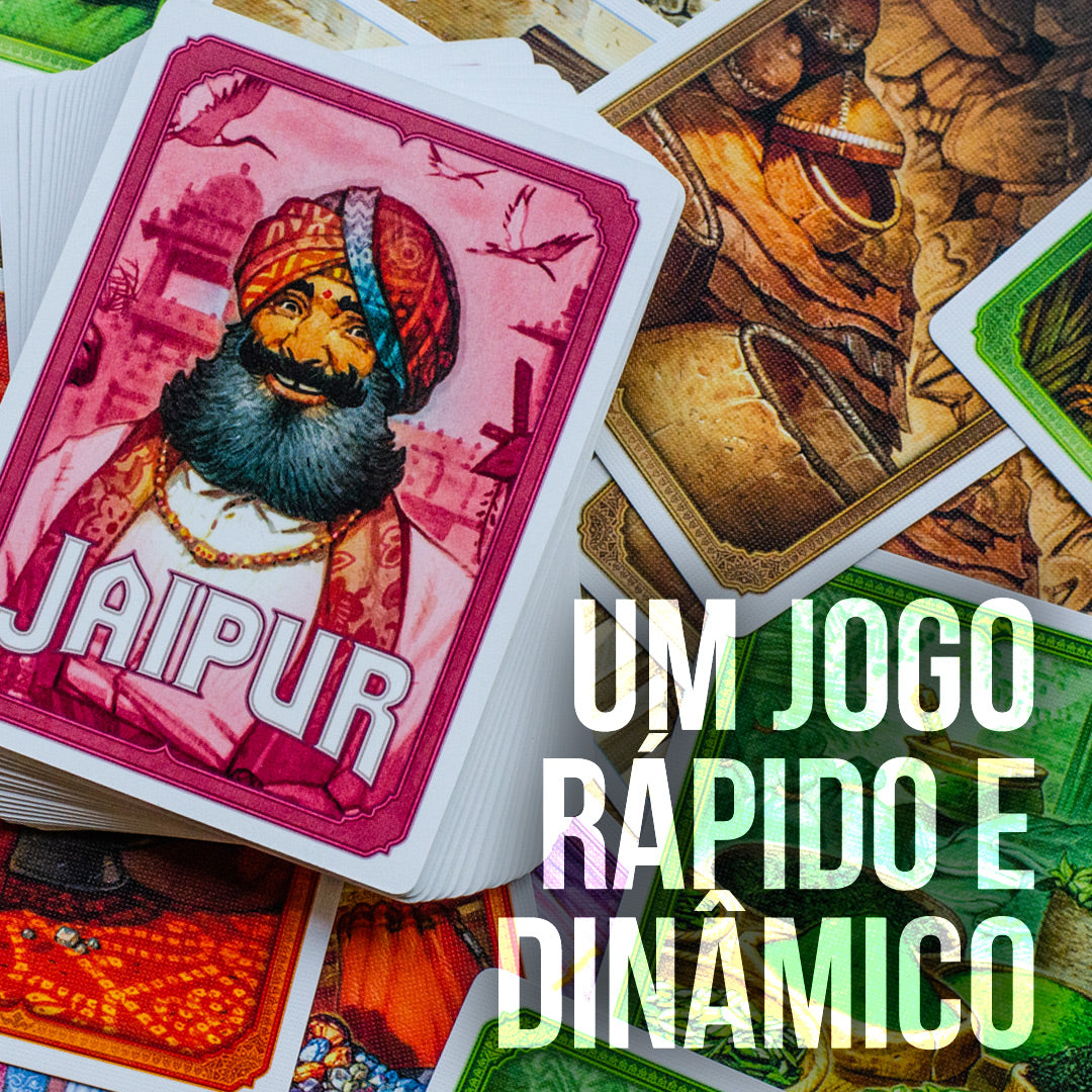 Jaipur é um jogo de cartas rápido, uma mistura de tática, risco e sorte. Na sua vez, você pode comprar ou vender cartas. Se comprar cartas, terá que escolher entre comprar todos os camelos, comprar uma carta do mercado ou trocar de 2 a 5 cartas entre o mercado e suas cartas.