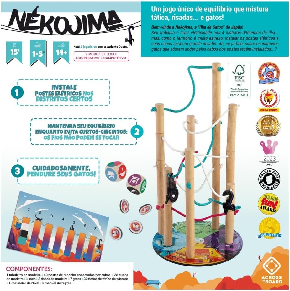 Nekojima é um jogo de tabuleiro que exige raciocínio, concentração e habilidade. PRÊMIOS: