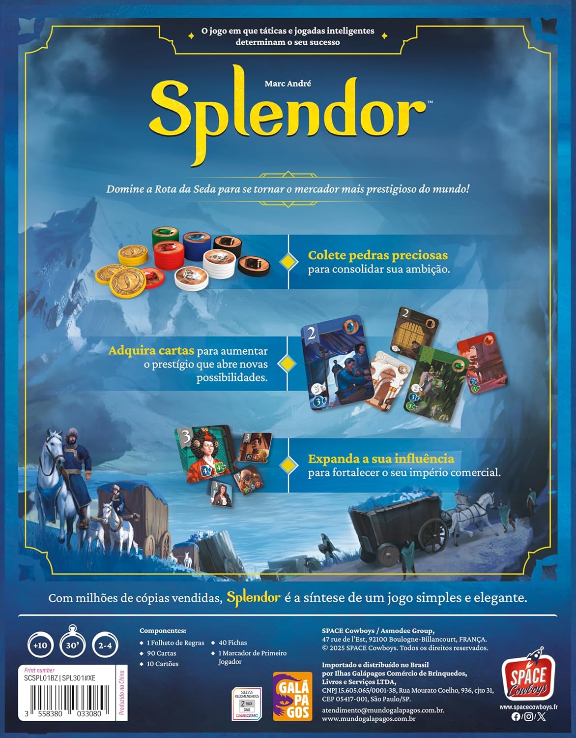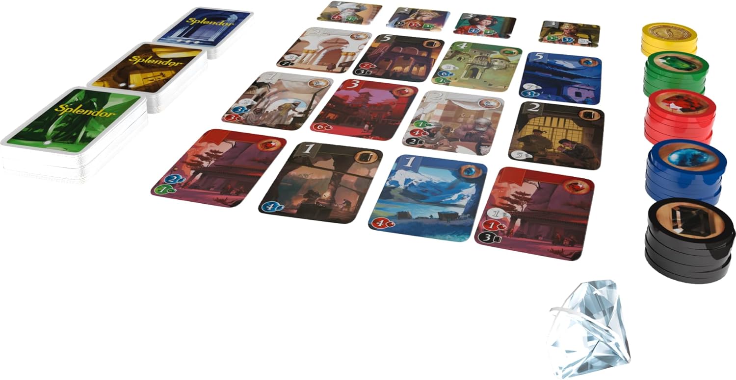 Splendor é um jogo de coleta de fichas e desenvolvimento de cartas. Os jogadores são mercadores da Renascença tentando comprar minas de pedras preciosas, meios de transporte, lojas — tudo para adquirir o máximo de pontos de prestígio. Se você for rico o suficiente, poderá até receber a visita de um nobre em algum momento, o que, claro, aumentará ainda mais seu prestígio.